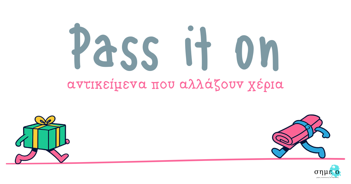 Το pass it on, λοιπόν, είναι μία κοινοτική διαδικασία του Σημείου που συμβαίνει διαδικτυακά και προσπαθεί να ενώσει άτομα από όλη την Ελλάδα. Κάθε φορά, το Σημείο προτείνει ένα αντικείμενο για να δοθεί σε κάποιο άτομο. Προσοχή όμως! Δεν συμμετέχεις για να πάρεις εσύ κάτι. Συμμετέχεις για να σκεφτείς κάποιο άλλο άτομο και να προτείνεις το αντικείμενο να πάει εκεί.